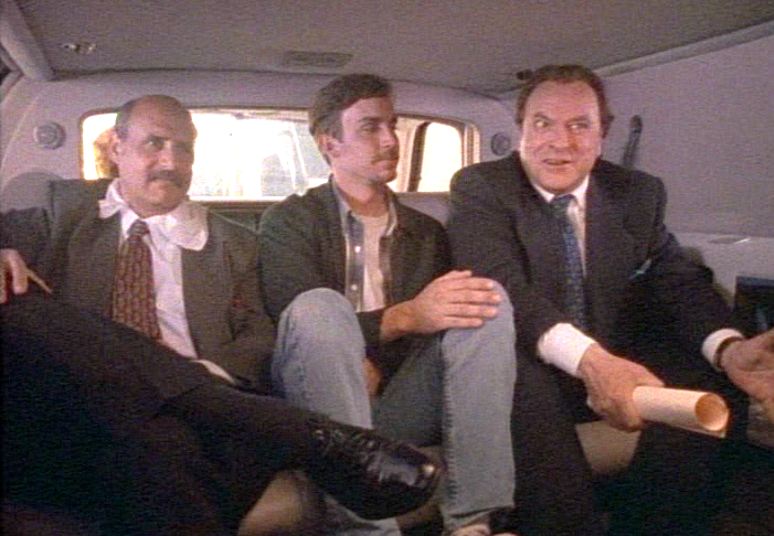Jon Lovitz sits in the back of a limo in the studio's parking lot. He asks his chauffeur (Mark Roberts) if he should just go up to the show's offices, but the driver tells him that they're sending someone down to escort him up. The driver asks Lovitz how many times he's done Larry's show. "I think like, thirteen. Fourteen if you count when I got bumped for Desert Storm. Fucking Saddam Hussein," Lovitz gripes. "You must like Larry a lot. Is that why you do it so often?" the driver inquires. "Yeah. I mean I like Larry a lot, but, you know, he's got this beautiful…" Lovitz self-censors as the chauffeur turns around. Lovitz questions whether he can use the limo's phone. The driver tells Lovitz he can and asks if he'd prefer that he raise the partition. "Well, let me ask you a question. Did you see City Slickers 2?" "No," the driver admits. "Well, then put it up," Lovitz says, making the motion of the partition rising with his hands.
